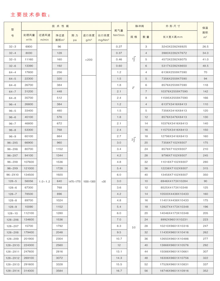 外濾式,采用大口徑脈沖閥,高壓、小氣量脈沖清灰清灰強(qiáng)度高,需壓縮空氣(0.5一0.7Mpa)。